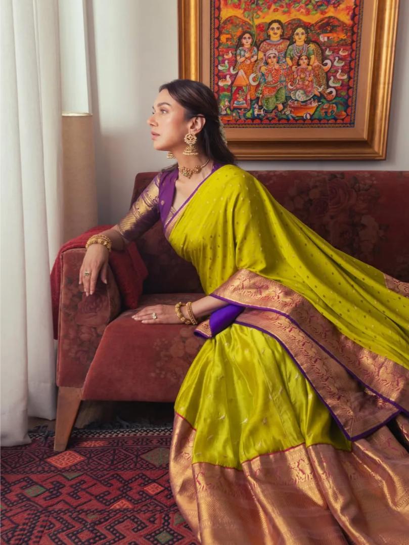 For a close friend’s wedding, Aditi Rao Hydari wore a handwoven Kanjeevaram silk sari by Gaurang Shah, built around a high-voltage pairing of lime green, royal purple and antique gold.