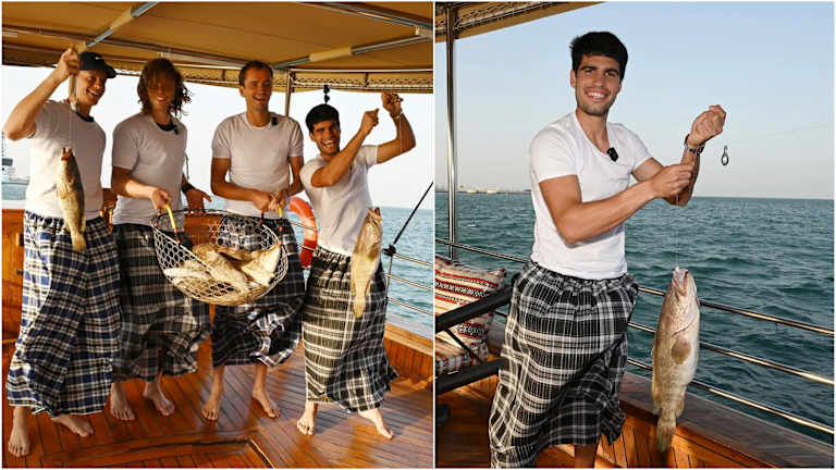 Alcaraz and Jannik Sinner joined besties Daniil Medvedev and Andrey Rublev for an outing on the water. The activity on offer: traditional Qatari fishing.