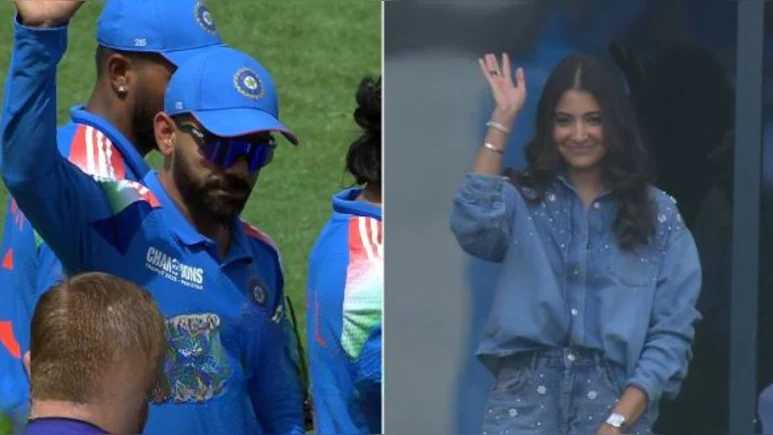 Dressed in a stylish denim-on-denim outfit, Anushka wore an oversized denim shirt paired with denim pants featuring subtle embroidery. She was spotted today at the stadium, waving from the stands to show her support. Virat, in return, waved back at her.