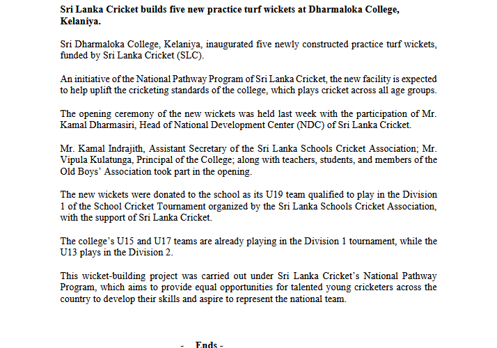Sri Lanka Cricket builds five new practice turf wickets at Dharmaloka College, Kelaniya.