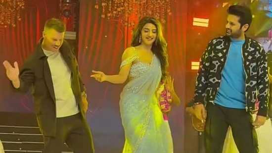 David Warner dances with Sreeleela and Nithiin
