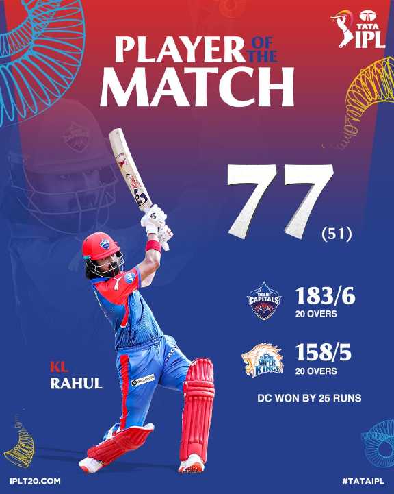Delhi Capitals K.L. Raul Player of the Match 77 as Chennai Super Kings get it wrong yet again at the Chepauk Stadium in Chennai