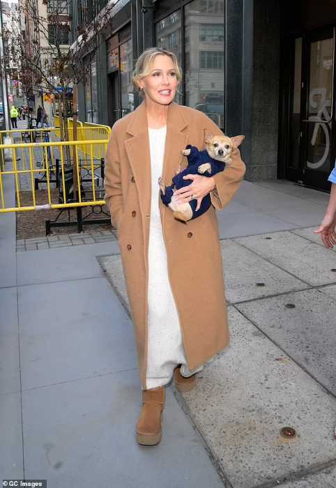 She also carried an adorable Chihuahua — which wore a cute navy sweater — in her arms like a baby.