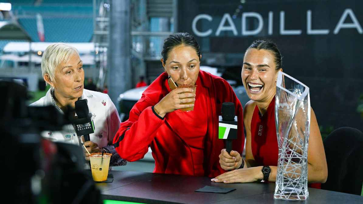 After world No. 1 Aryna Sabalenka defeated Pegula in straight sets to win her first Miami Open title, Sabalenka stopped by the Tennis Channel desk for a champion’s chat with Martina Navratilova and Prakash Amritraj. In a celebratory mood, she sipped a “Marg-Aryna,” her signature Maestro Dobel Tequila drink, during the interview.