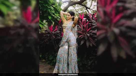 Another stunning feature of the printed sharara set was its versatility. It could also be worn like a saree thanks to the detachable pallu. Khushi paired the contemporary fit with matching pants that accentuated her svelte frame. A pair of stone-studded stud earrings and a triangle-shaped bracelet suited the aesthetics. Golden-hued box heels from Stoffa sealed her final look.