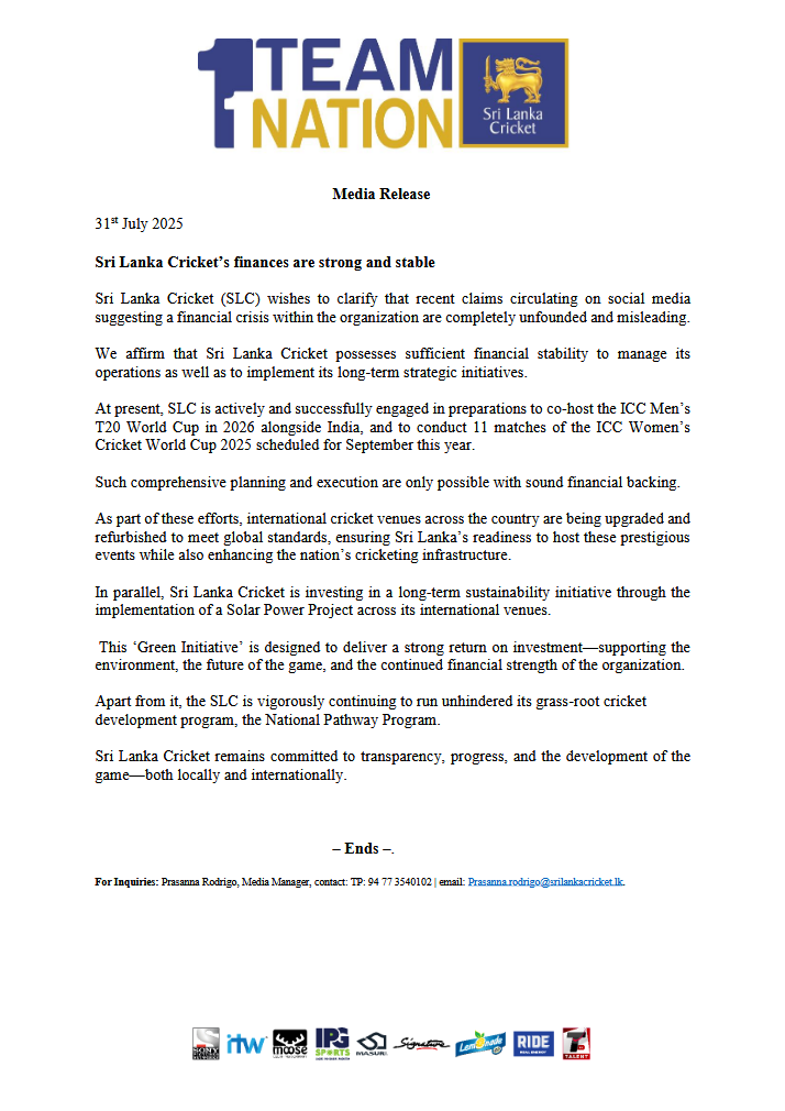 Media Release – Sri Lanka Cricket’s finances are strong and stable Posted by GoForGold August 1, 2025 1 View GoForGold August 1, 2025