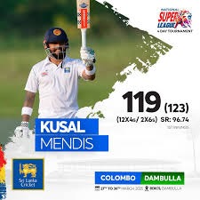 Mendis fine-tuned his innings with 12 boundaries and 2 sixes in adding on 67 for the fifth wicket with skipper Charith Asalanka who score 43 off 70 hitting 4 boundaries and a six after Colombo opted to bat first on winning the toss. He added a further 96 for the seventh wicket together with Lahiru Madushanka 43 off 88 ith of 4 boundaries.