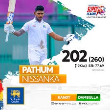 Pathum Nissanka career best 202, Sohan de Livera 142 in Kandy’s 453 vs Dambulla 207/4 Dhananjaya de Silva n.o. 81, Dasun Shanaka n.o. 34; Galle 263/7 vs Jaffna 305