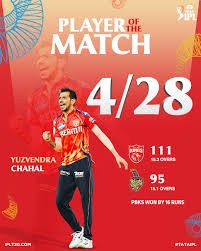 Kolkota Knight Riders then looked on course on 66 for 2 wickets with Ajankya Rahane on 17 and Angaish Raguvansi batting sensibly for his 34. Then came Yuzvendra Chahal as he filled up the senses of the entire Chandigarh Stadium like a night in the forest as 6 wickets tumbled down in 5.1 overs, thus proving his fantastic control of accuracy in the art of leg spin accounting for 6 batters for the addition of just 17 runs.