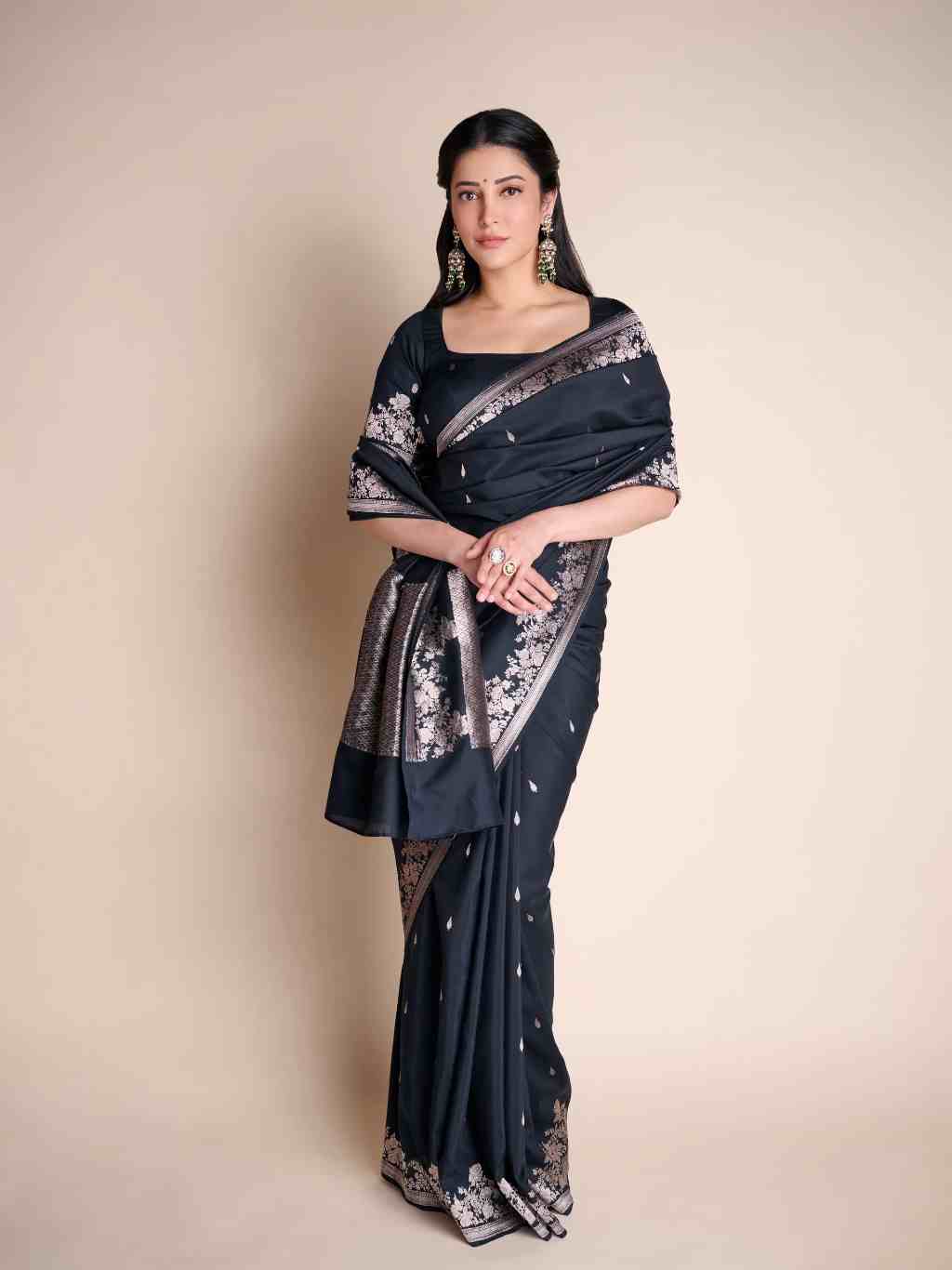 Shruti Haasan didn’t reach for the usual reds or golds this festive season. Instead, she chose a midnight-toned Banarasi from Shanti Banaras, proof that black silk can feel just as ceremonial as any jewel hue.