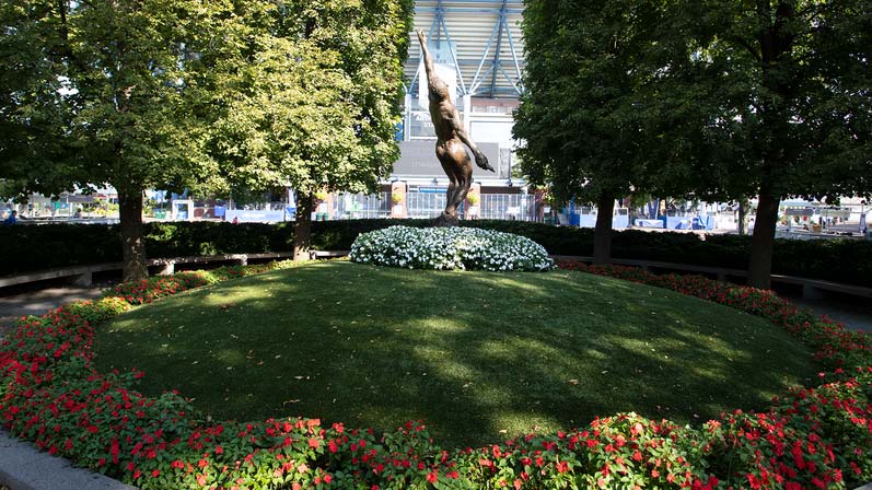 Standing at 14 feet high and weighing two tons, the bronze-cast sculpture is located exactly between Corona Park’s Unisphere and Arthur Ashe Stadium, the subject himself wielding not a racquet but a baton. That’s not an accident.