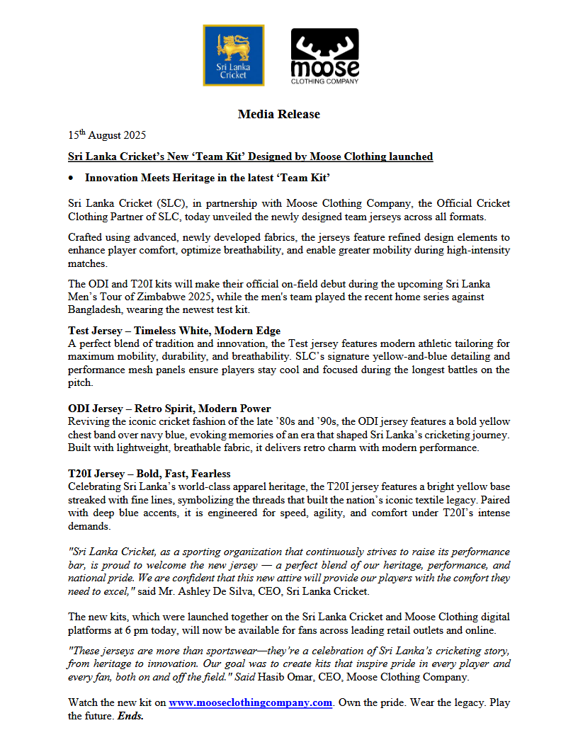 Sri Lanka Cricket’s New ‘Team Kit’ Designed by Moose Clothing launched-1 Posted by GoForGold August 18, 2025 1 View Sri Lanka Cricket’s New ‘Team Kit’ Designed by Moose Clothing launched-1 GoForGold August 18, 2025
