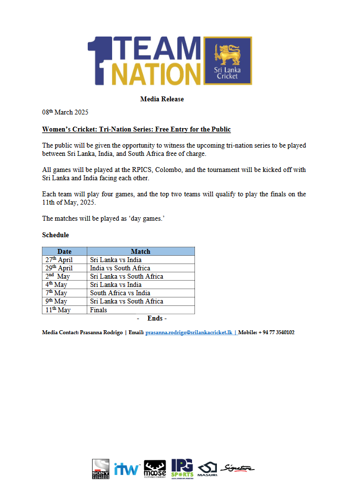 Women’s Cricket: Tri-Nation Series: Free Entry for the Public Posted by GoForGold April 8, 2025 11 Views Media Release – SLCM202532 – Women’s Cricket – Free-entry to witness the upcoming Tri-Nation One Day Tournament GoForGold April 8, 2025